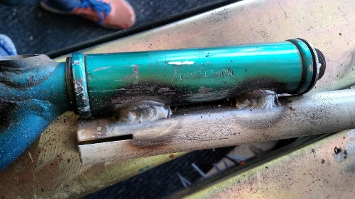 This was because the crashed wheel was very very out of tru (no longer consistently round). Initially I thought I would just weld the steerer tube to the long section of tube but this proved impossible as it would have impeded the rotation of the fork.