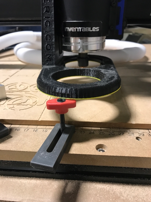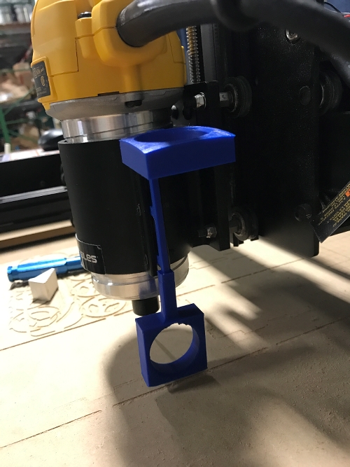 Having a CNC Router is awesome. Having to constantly clean up shavings is not. To more cleanly operate the X-Carve we decided to go ahead and print a dust shoe to attach a vacuum to. This would allow us to suck up all the shavings and dust as the machine operates and keep the work space cleaner. Searching online we found a design that could be easily printed and attached to the spindle. However, once we printed it we had concerns that the shape of this part would interfere with clamps and thus reduce the overall cutting area we had access to. Considering this, we decided to design our own system for sucking up the mess.