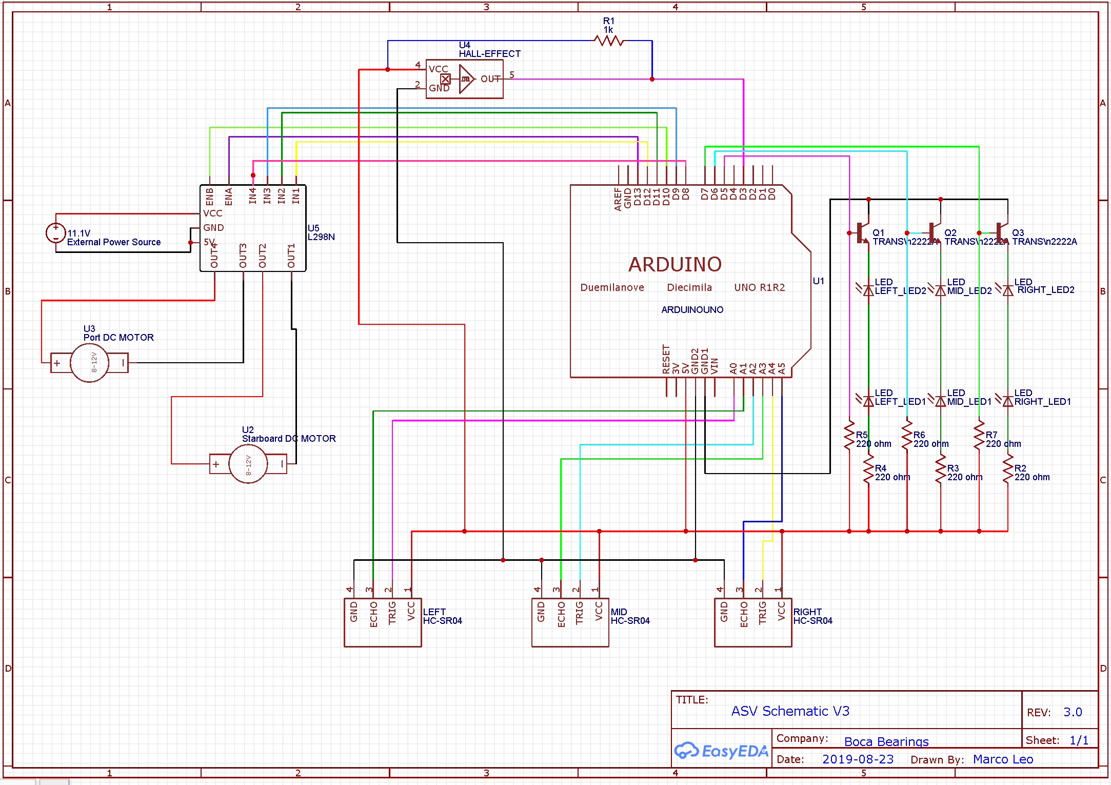 The final design schematic is shown below. It includes the Arduino Uno that will be the main controller. There is a L298 motor controller that will control the thrusters of the ASV which will also be powered by an 11.1V LiPo battery. The hall-effect switch will start the ASV. The three HC-SR04 ultrasonic sensors will locate the obstacles and trigger the six total LED lights to light up. The left LED lights will light up when an obstacle is detected to the left of the ASV and the same with the middle and right LEDs. They are connected in a combination of series and parallel circuits with a 2222A transistors.