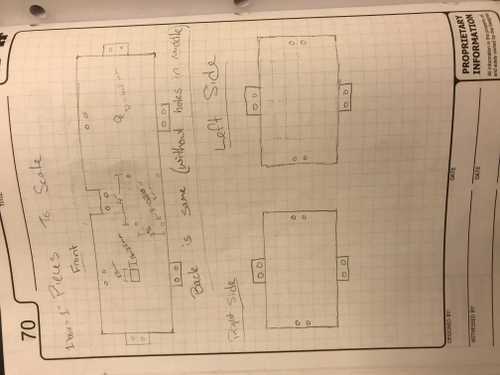 I realized that this isn’t practical as it is much easier to create an angular encasing than to attach one to angled bars. This design features a trapezoidal side view. The bottom will be parallel to the ground and the top will sit at a 60 degree angle. The sketches for the pieces can be seen below.
