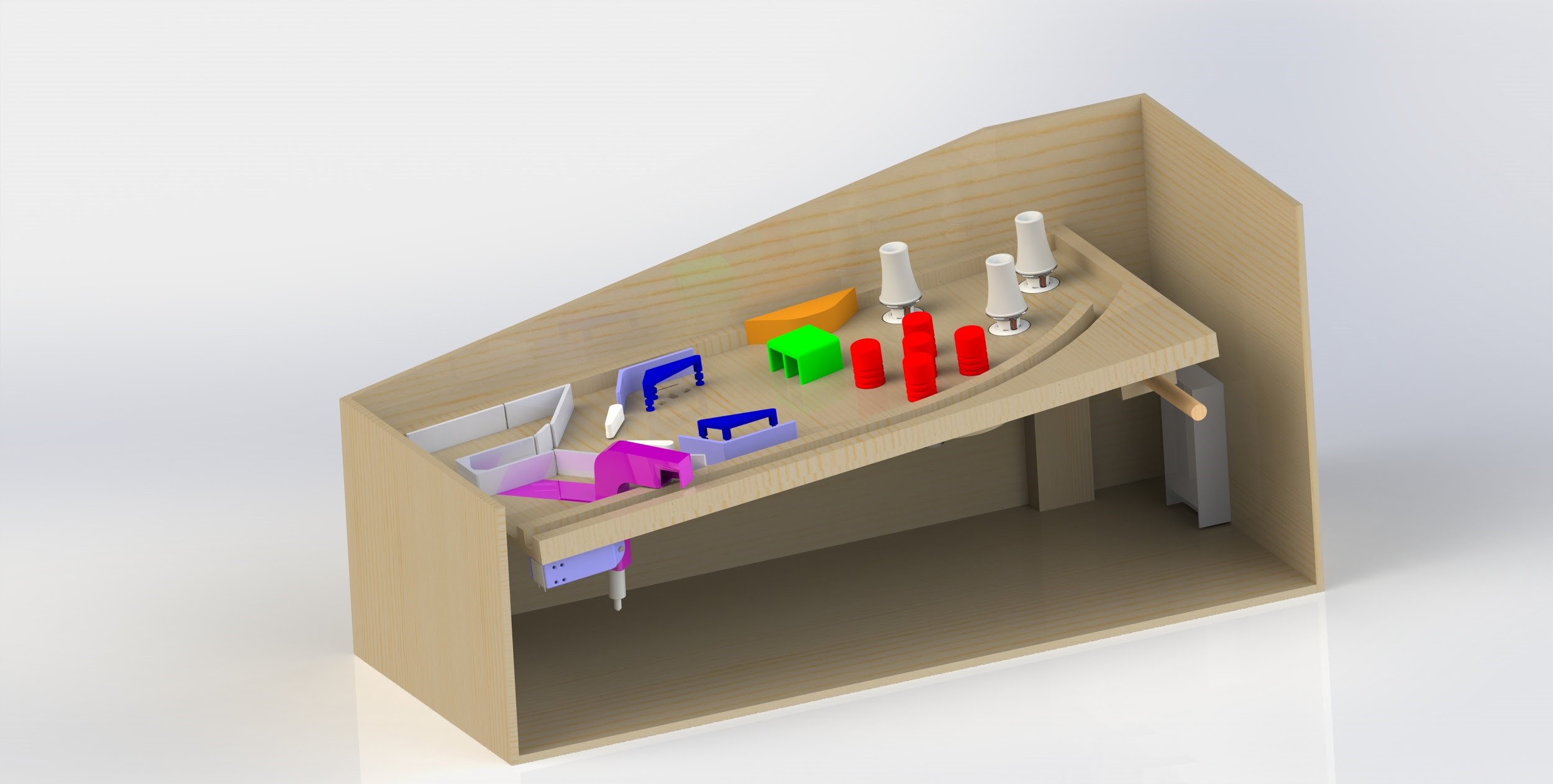 In adding these features I had to tweak a few things on the board to make the new parts fit with minimal interference on the underside of the play board. This further illustrated why it is necessary to take the time to make a good model and then the assembly process goes so much smoother. But after taking the time to make these adjustments I know that everything will work smoothly when I go to build the real thing.