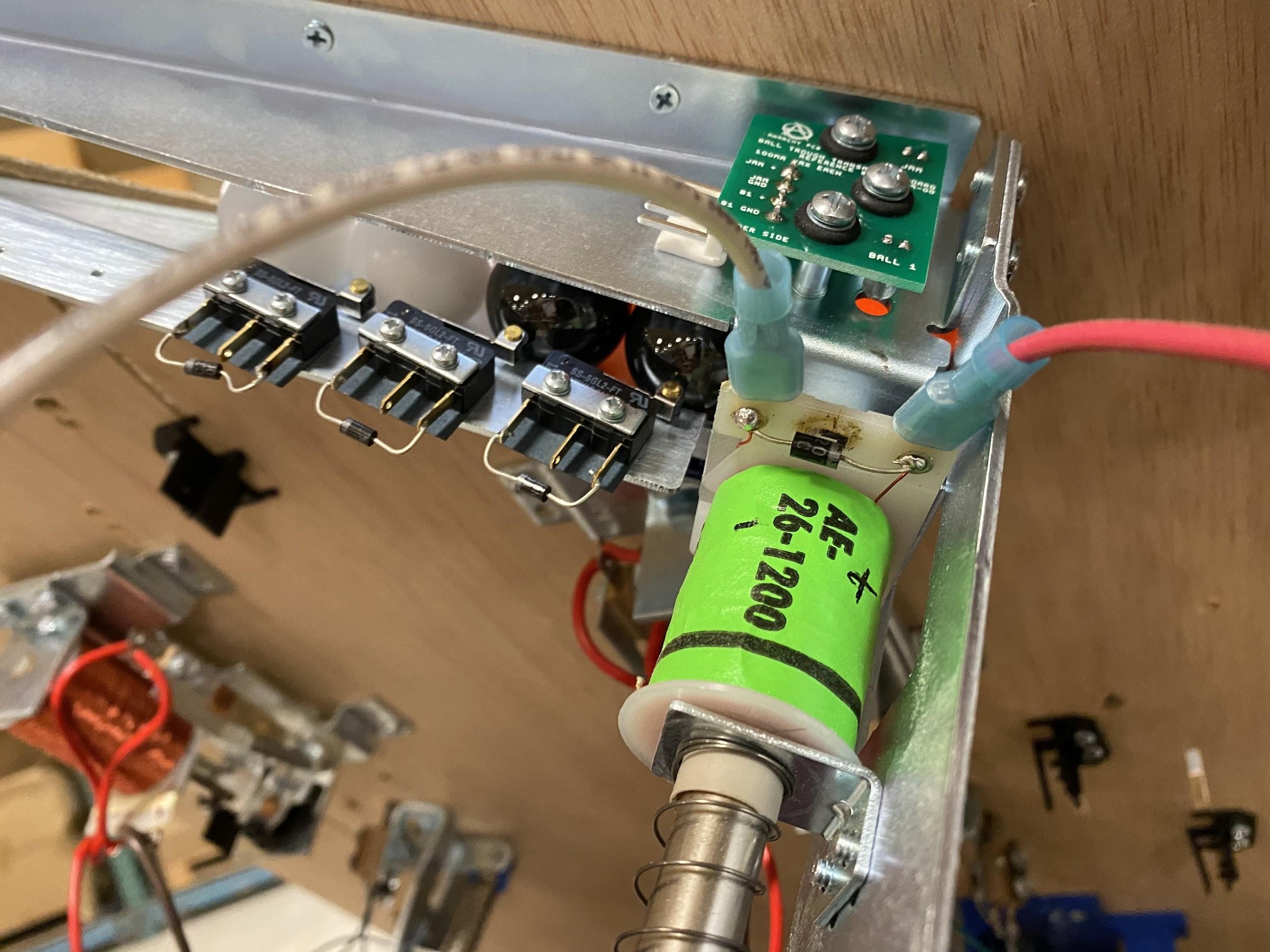 Now that I have covered what was done to get this thing working and why the scoreboard was abandoned, lets go over some of the flaws of the system. And we’ll start with one of the most glaring flaws, the launching system. The problem with this system is that it lacks the power to adequately launch a stainless steel ball bearing and as opposed to redesigning it in such a way that would resolve this issue I used Silicon Nitride ceramic bearings. If this were to be put into large scale production or even for someone trying to recreate this machine at home this is a problem from a cost standpoint as for the average consumer these balls would run about $70 a pop thus they are very cost prohibitive. A solution to this problem would be to use a plastic ball bearing but this introduces a new problem of the game being almost unplayably fast. This may also be able to be solved by making the ball kick out onto the play field sooner as opposed to all the way at the top like it is now. So while this is an issue to watch out for there are enough work arounds for this that anyone following along at home should not run into much trouble here.