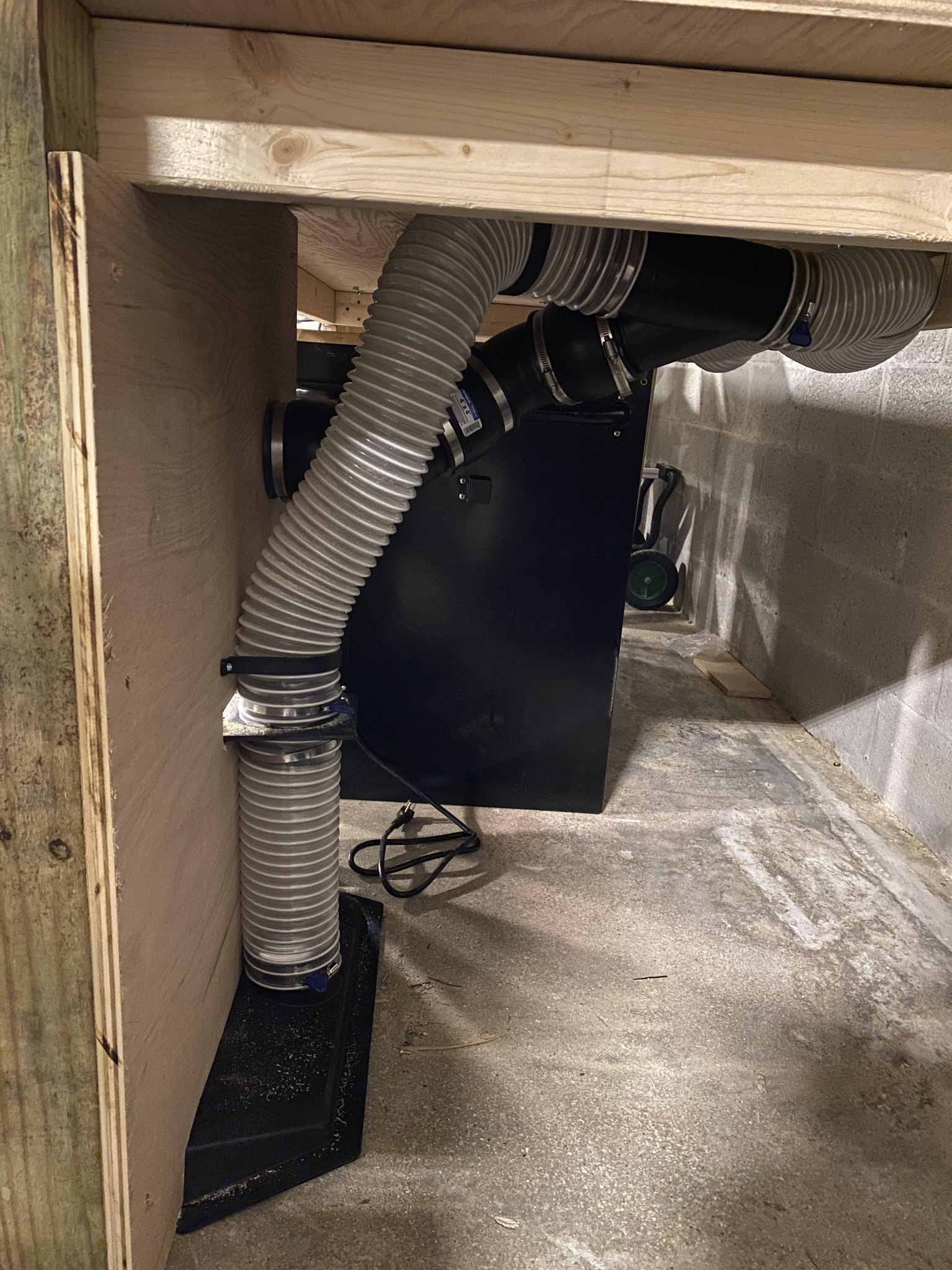 After the drawers were installed the last thing to do was finish installing the dust collection system. The core part of this system is the dust collection unit itself, for this we went with a 1 HP unit by Delta as it was the most powerful and best reviewed unit that still used a standard 15 amp plug. This unit can be found here: https://www.homedepot.com/p/Delta-1-HP-Induction-Motor-750-CFM-Dust-Collection-System-50-723-T2/302270622#overlay . Once we had that taken care of we went about Plumbing the vacuum lines under the workbench. For this we decided to give a vacuum port for every major tool we had, and since that worked out to 5 ports with the addition of the sweep port we had to use gate valves so as to not lose significant amounts of suction. This way we can open the suction for the tools we are using and close off the suction on the rest of the tools for optimal efficiency.
