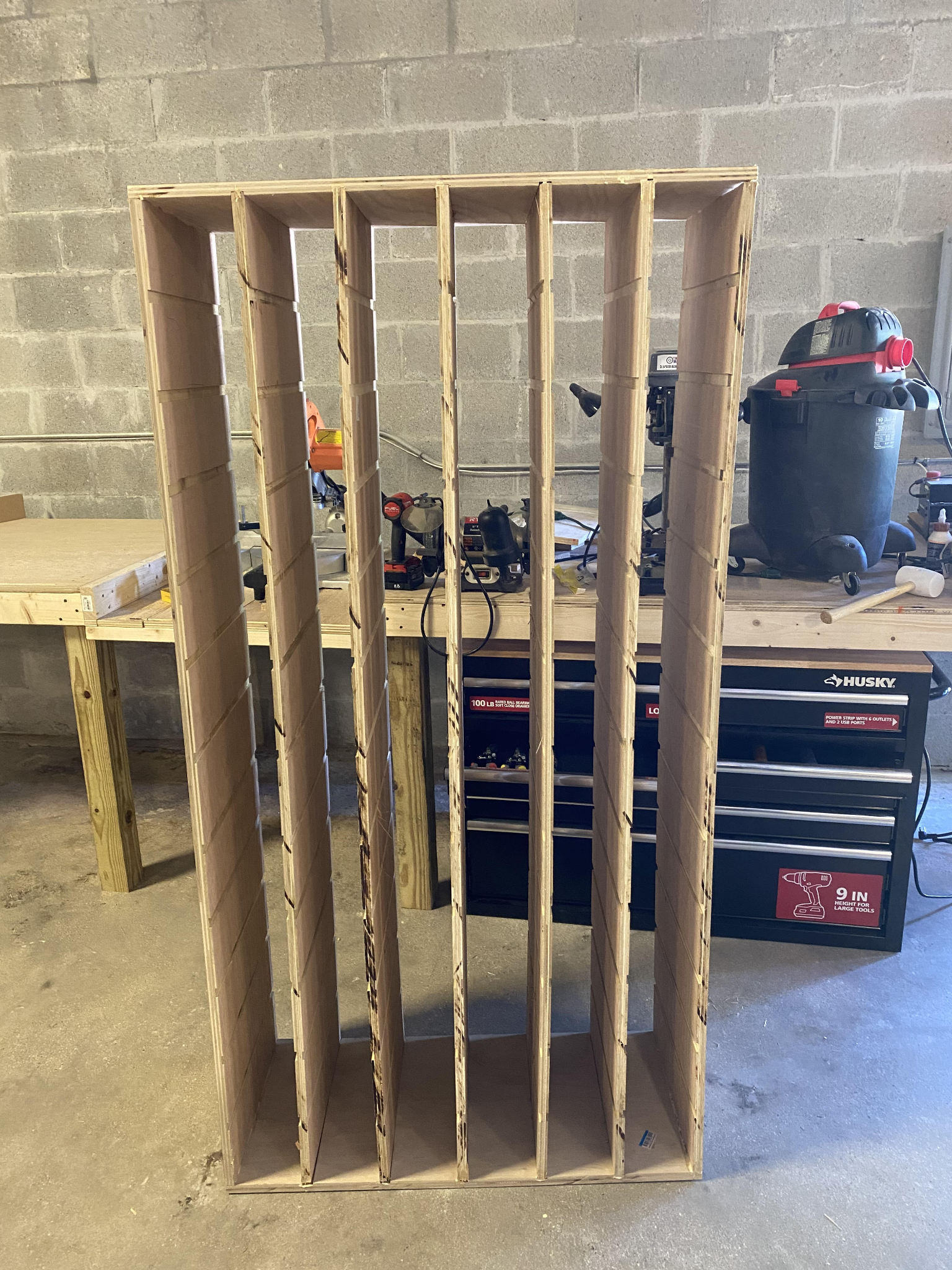 Once that was completed we were able to make use of our new workstation by starting to build the hardware storage drawers. To do this we cut seven sections of plywood into 16in wide strips to make the ribs for the drawer sections. A dado was then used to cut slots for the shelves that the drawers would sit on. These ribs were then attached to a top and bottom piece of plywood as seem in the picture below.