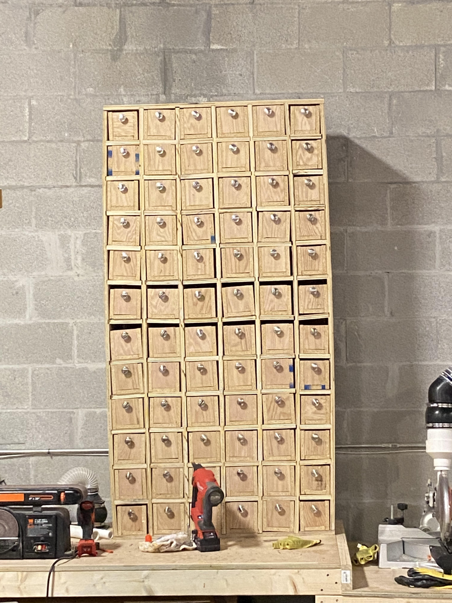 A plywood sheet was then cut to size and put on as backing to keep the drawers from being pushed out the back and to give a little more structural rigidity to them. As we used oak for this due to the lumber shortage, the frame was very heavy and we had to use a forklift to lift it the 3ft to get it on top of the workbench. Once it was on the workbench 2x4 were added to the underside of the workbench to give something for the securing screws to bite into. If these were not added there would have been a serious risk of the screws ripping out and the entire structure falling over, which at best would ruin hundreds of dollars-worth of material, and at worst injure or kill someone. This is why it is crucial to always over build and over secure when in doubt.