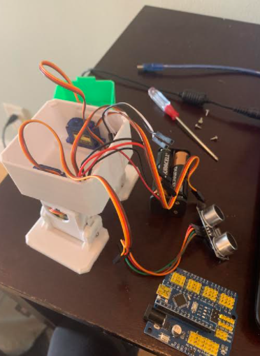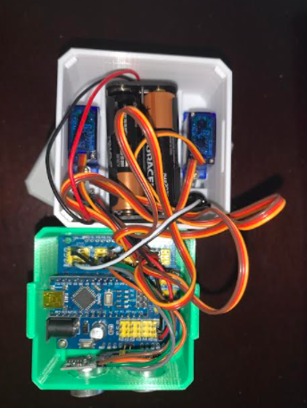 After trying all three functions and none were successful, I moved to the idea of completely rewiring the system. With this being said I started by unplugging all of the female wires from the Arduino board and followed a wiring schematic found on the OTTO DIY website to reassure that everything was plugged in Properly. I found that nothing was wrong with the installation of the servo motors that power the robot's legs, as well as the ultrasonic sensor. The only thing left to connect was the 4 AA power source. When looking at the schematic compared to what the robot already had plugged in, I found that the positive and negative connections were not placed properly on the board. Once corrected the Robot fired up properly and started walking without a USB connection. Listed below are some photos of the deconstruction and reconstruction the OTTO Robot went through.